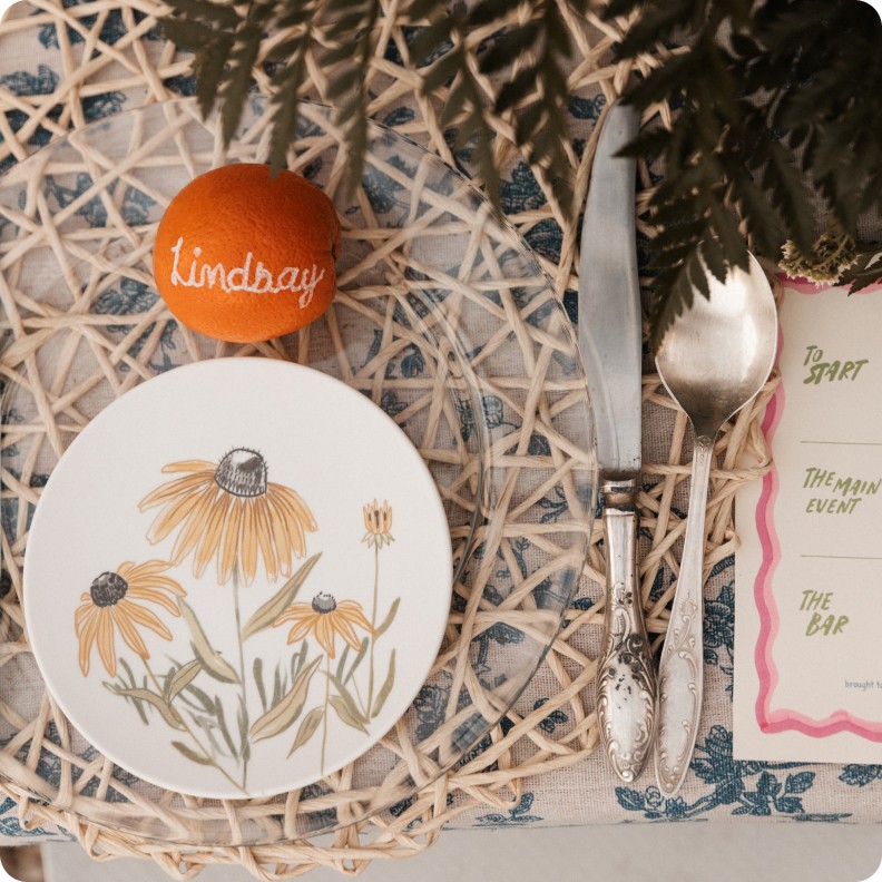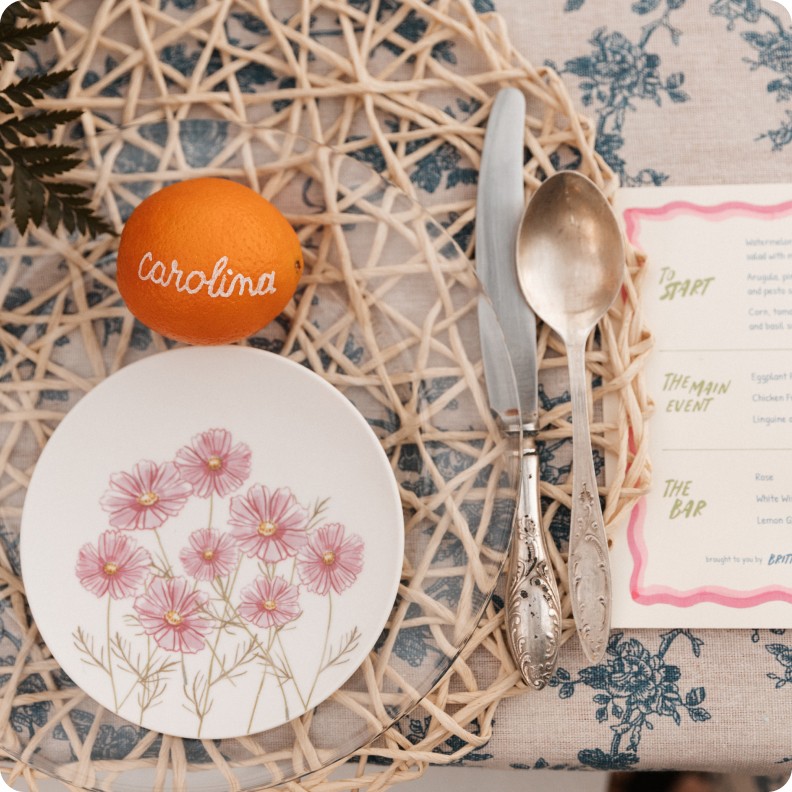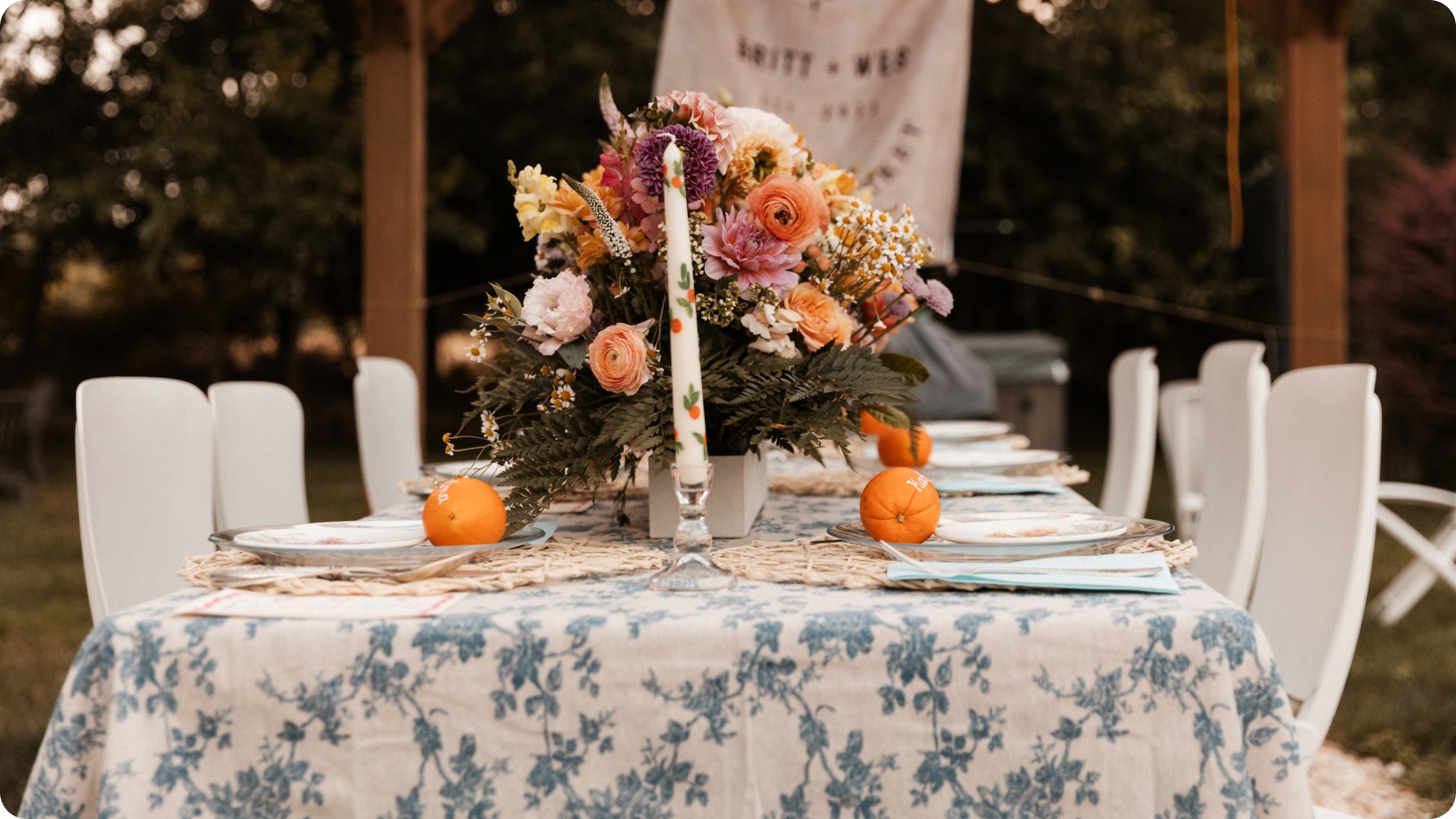 My dream backyard dinner party complete with a blue floral table cloth, mismatched floral appetizer plates, hand painted candles, hand drawn orange place cards, whimsical menus, and the most beautiful flowers!