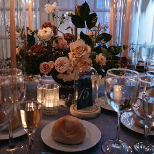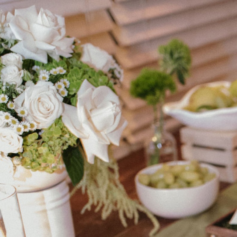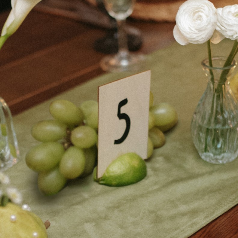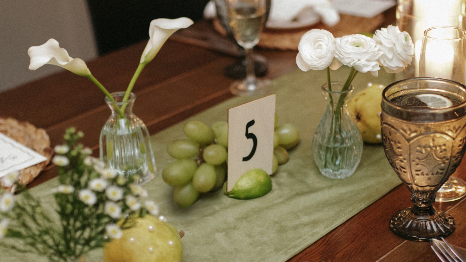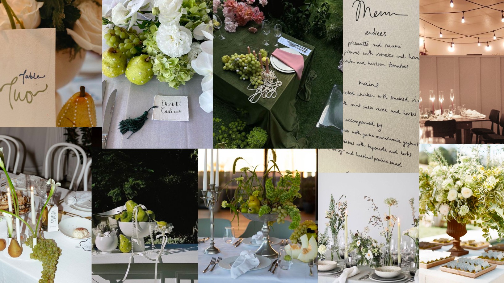 The color scheme featured green and white, with a mix of white flowers, greenery, white pearls, and green fruit. I adored the stylish green velvet vibe paired with the ambient candlelight and the charming bistro lights hanging from the restaurant ceiling.
