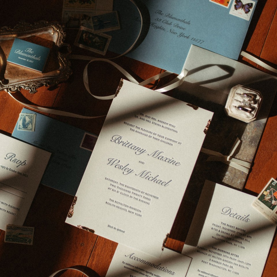 Our invitations exuded timeless elegance and a classic aesthetic. Crafted through letterpress on soft white paper, they featured hand-done gold foil detailing, lending a touch of sophistication with a subtle rough edge.
