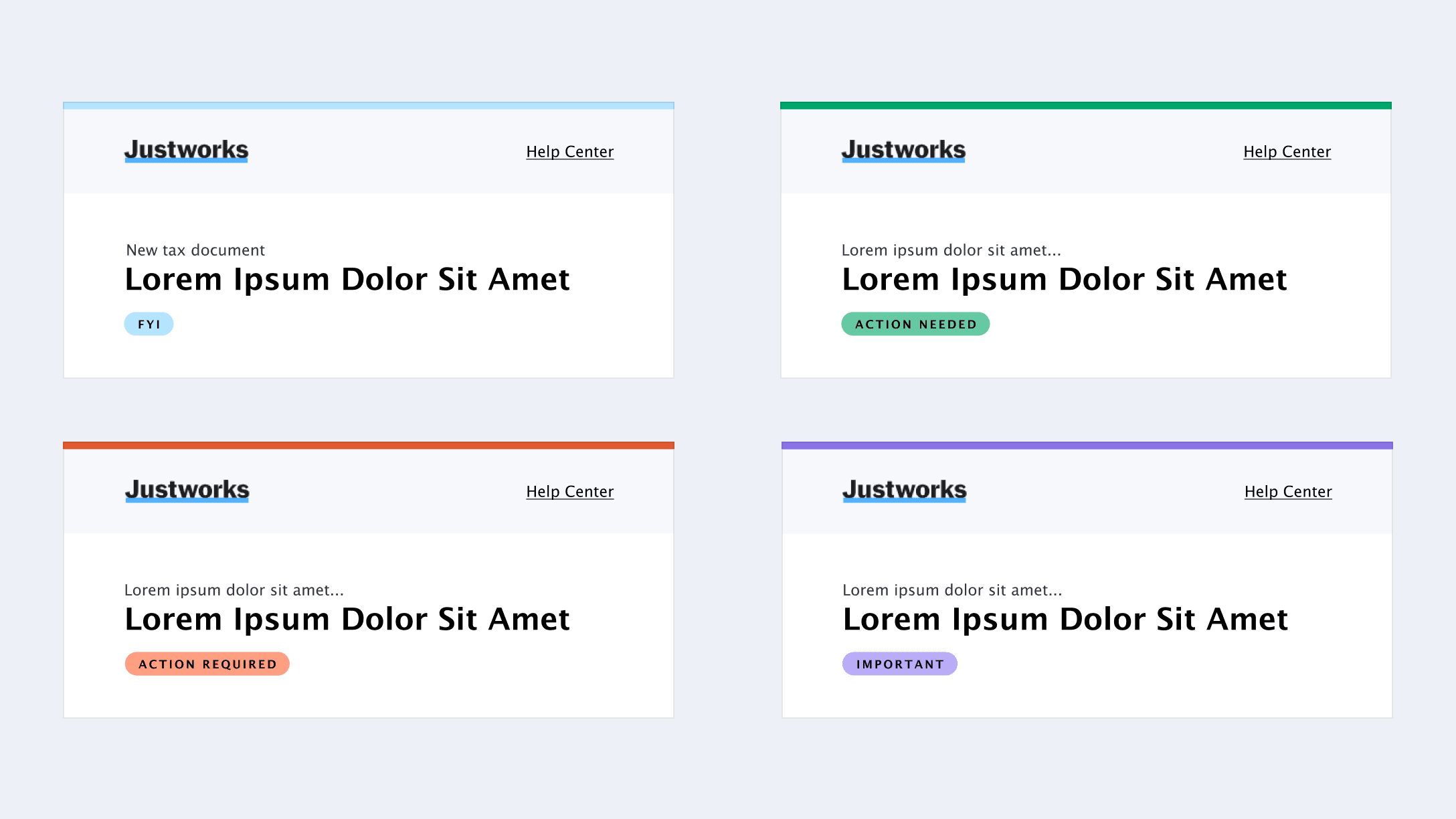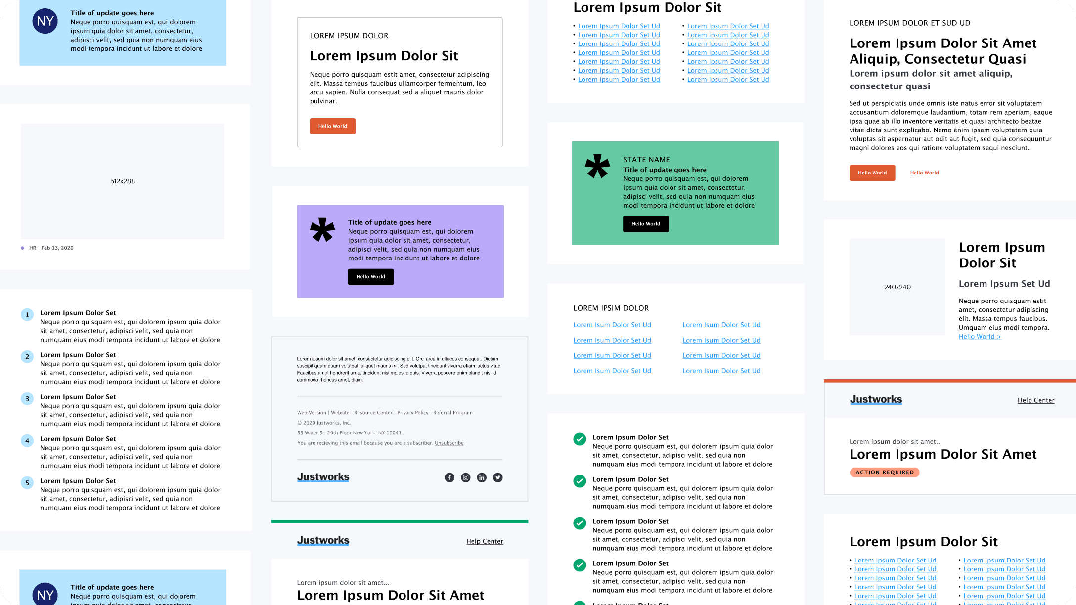 Built out email modules for all use cases that could be mixed and matched to build Justworks marketing and customer emails. Audited all Justworks emails to come up with the necessary content layouts and structures.