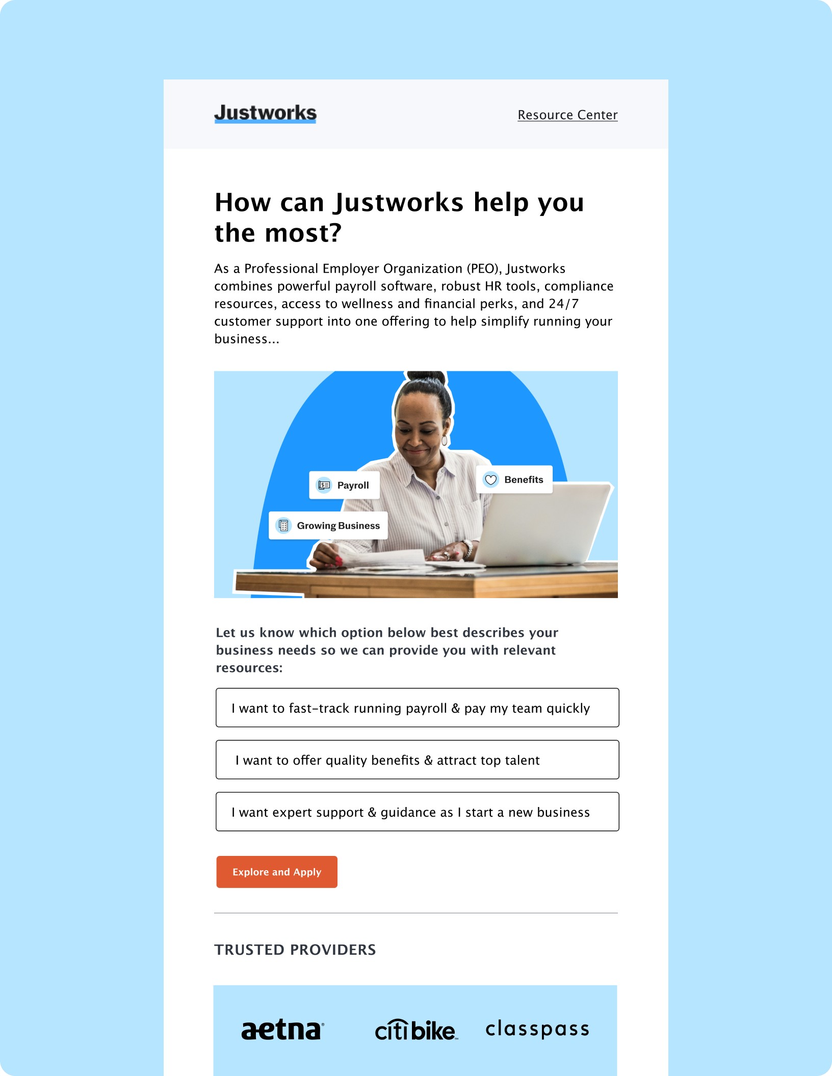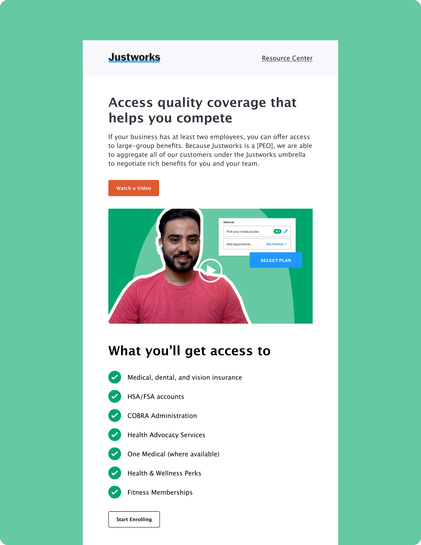 Built a modular email system that could be mixed and matched and used across Justworks' automated emails, lead nurture flows, special campaigns, and customer emails. Facilitated knowledge transfer to both marketing and customer teams, empowering them with self-serve capabilities to efficiently implement and scale these designs throughout all email communications.