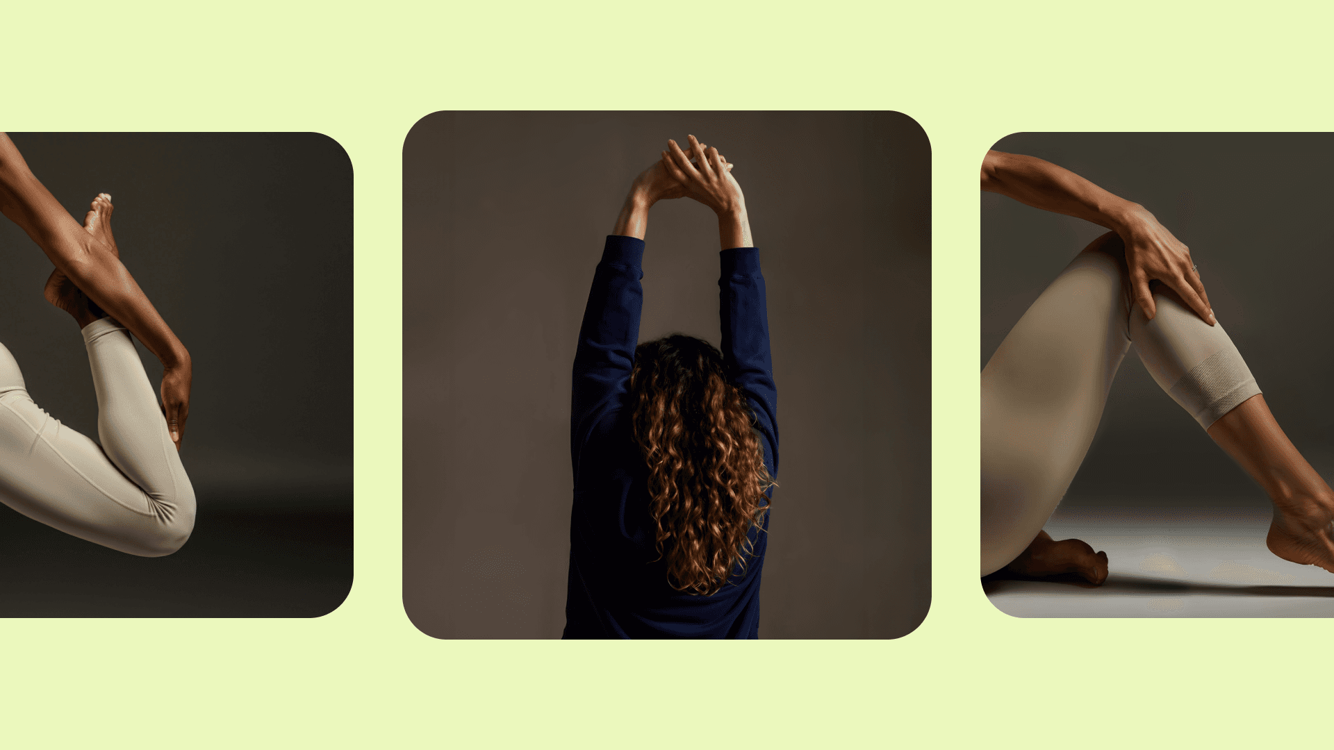 Let’s Feel Good’s photography features a vintage hue, highlighting faceless workout scenes and activewear in brand colors, minimalist product shots, and textured images of fresh produce and whole foods.