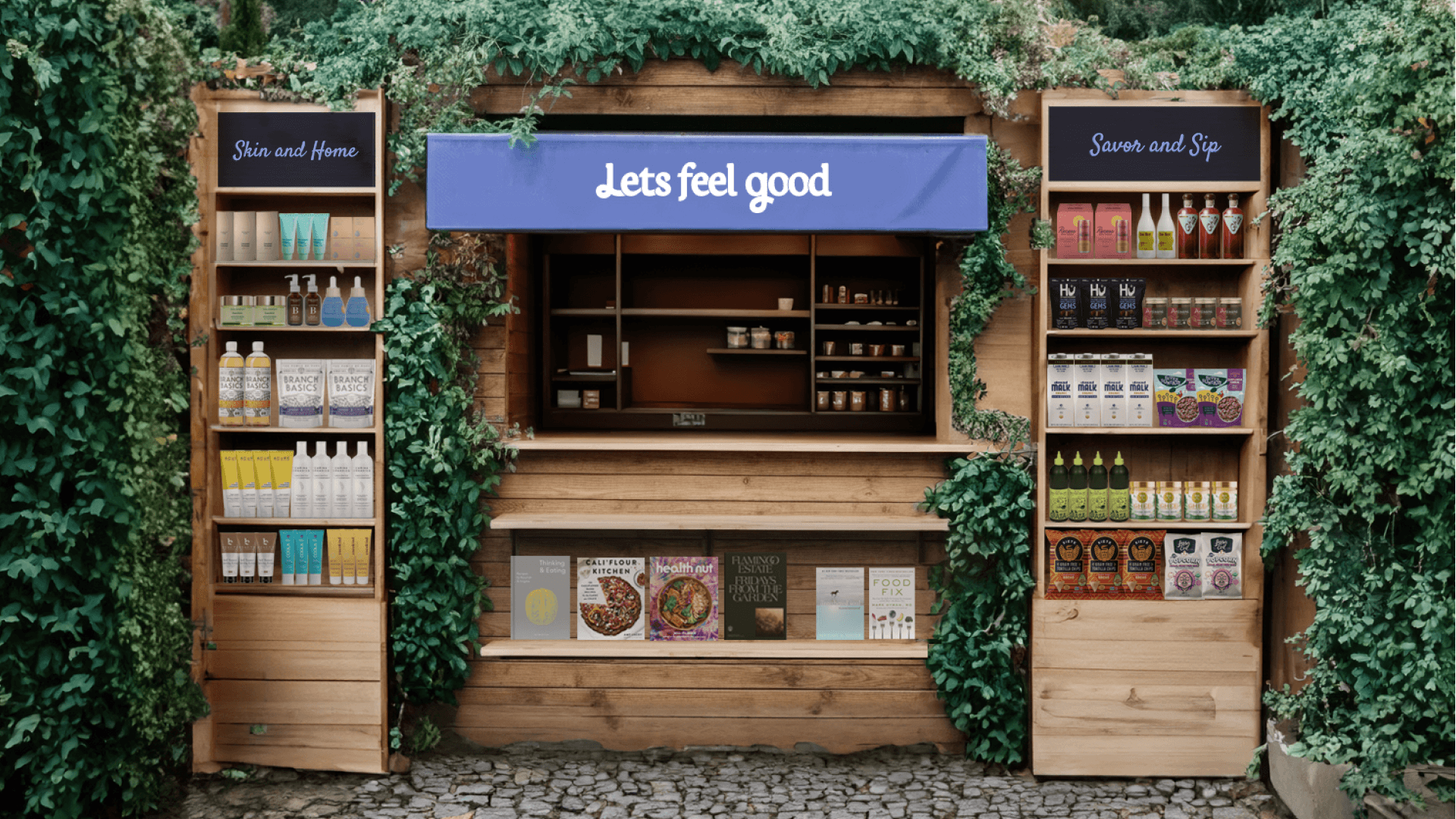Imagine Let’s Feel Good transforming their product recommendations into a beautiful green pop-up, featuring cookbooks and educational resources.